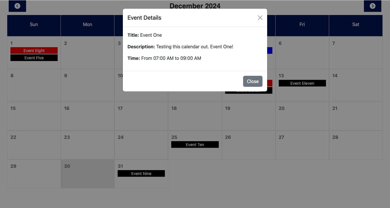 • View Events: Click on any event to view its details in a sleek Bootstrap 5.3 modal.